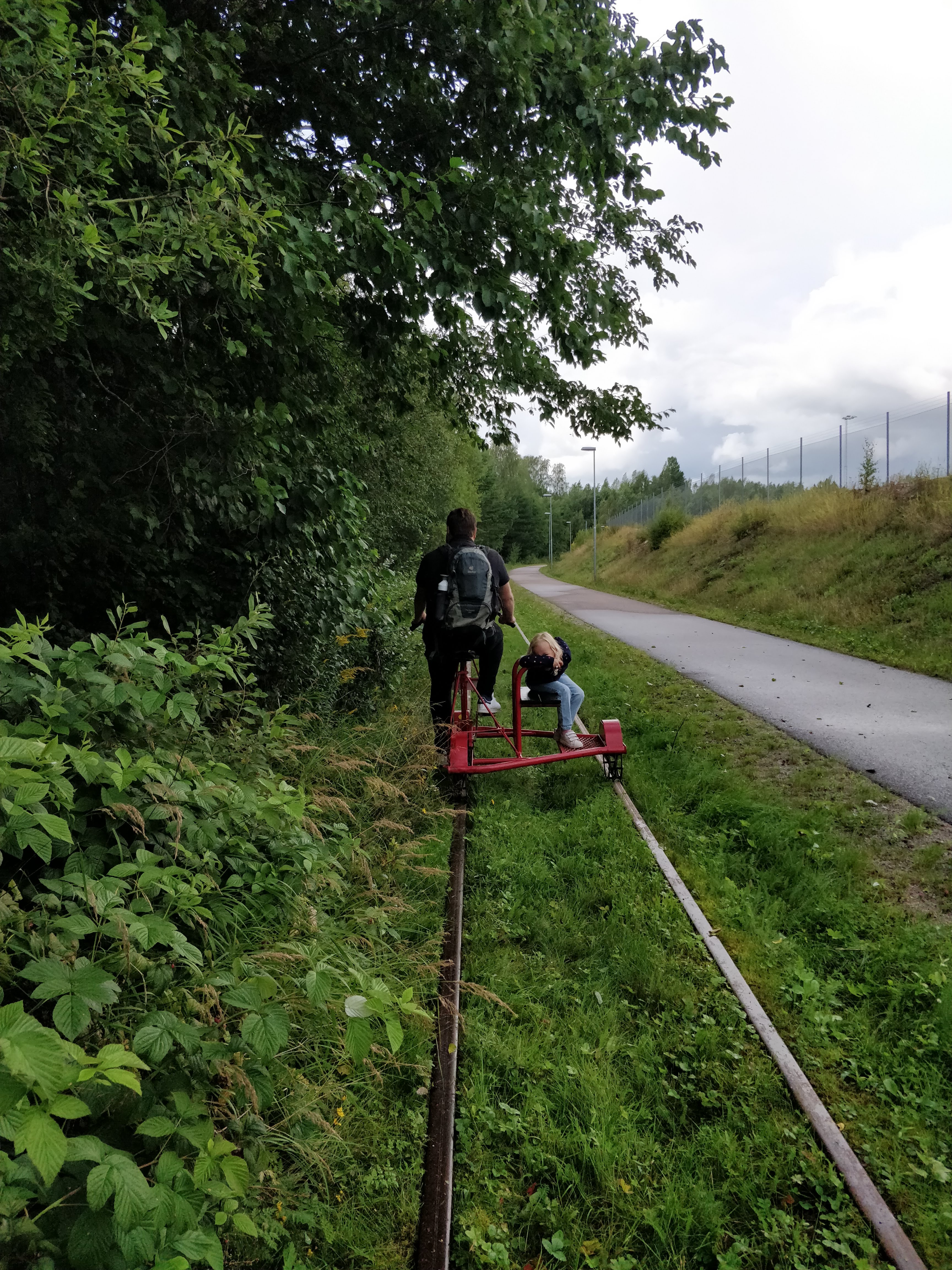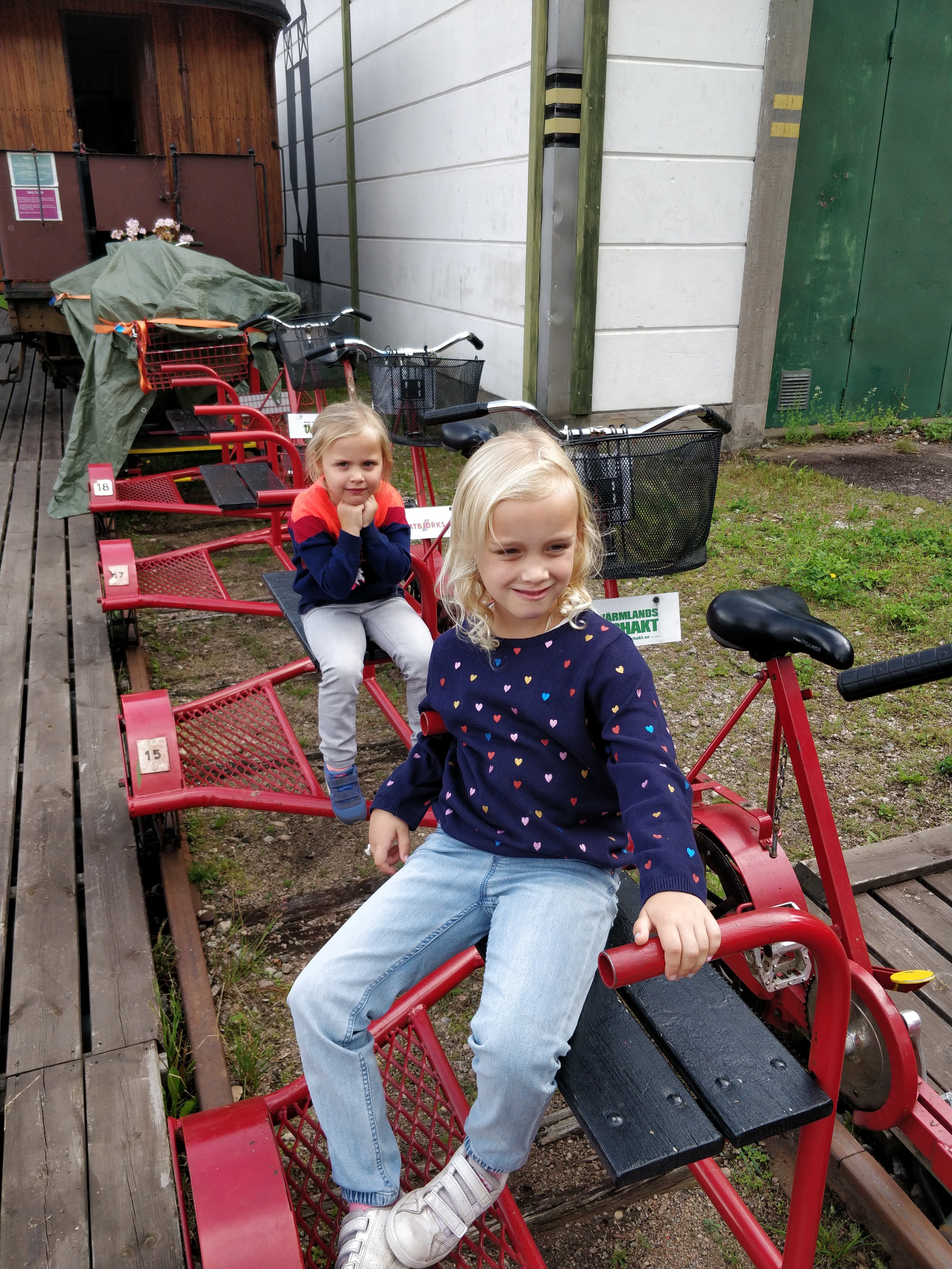 We waren eigenlijk wel blij om te zien dat er vanalles te doen was in de nabije omgeving. We moesten nooit echt super lang rijden voor we ergens waren. Dit was wel anders bij de vorige twee bestemmingen. De uitstap van de dag was naar, wait for it :-), Hagfors Railroad Museum. Ik hoor het jullie al denken, wat gingen ze daar nu weer doen? Wel buiten het feit dat er een museum is met allemaal oude trein locomotieven, is er ook een oud treinspoor van ongeveer 12 km heen en terug. En daar gingen we dus voor. Rowin en ik kregen elk een spoorfiets met een zijspan waar de kindjes in kunnen zitten. Zalig! Ik denk dat de kindjes de eerste kilometers niets anders gedaan hebben dan gegiecheld. Naast prachtige natuur, kwamen we ook de typische Zweedse huisjes tegen op onze weg. Het was echt een heel leuke ervaring, eerst hadden we wat schrik van de afstand, maar al bij al was het heel vlot gegaan. Zeker een aanrader. En eens binnen was het tijd voor fika! We kregen bij ons ticket een kop koffie of thee aangeboden met koekjes. Heerlijk na zo’n fietstocht. Eens we binnen waren begon het ineens kei hard te regenen en ook daar waren we dan weer blij om, want onderweg waren we geen enkele druppel tegengekomen. Na de fika namen we ook even de tijd om het museum en de treinstellen te bekijken. Vooral leuk voor de meisjes, want die mochten overal in en op, dus ook hier kwam hun fantasie weer ten volle naar boven :-).