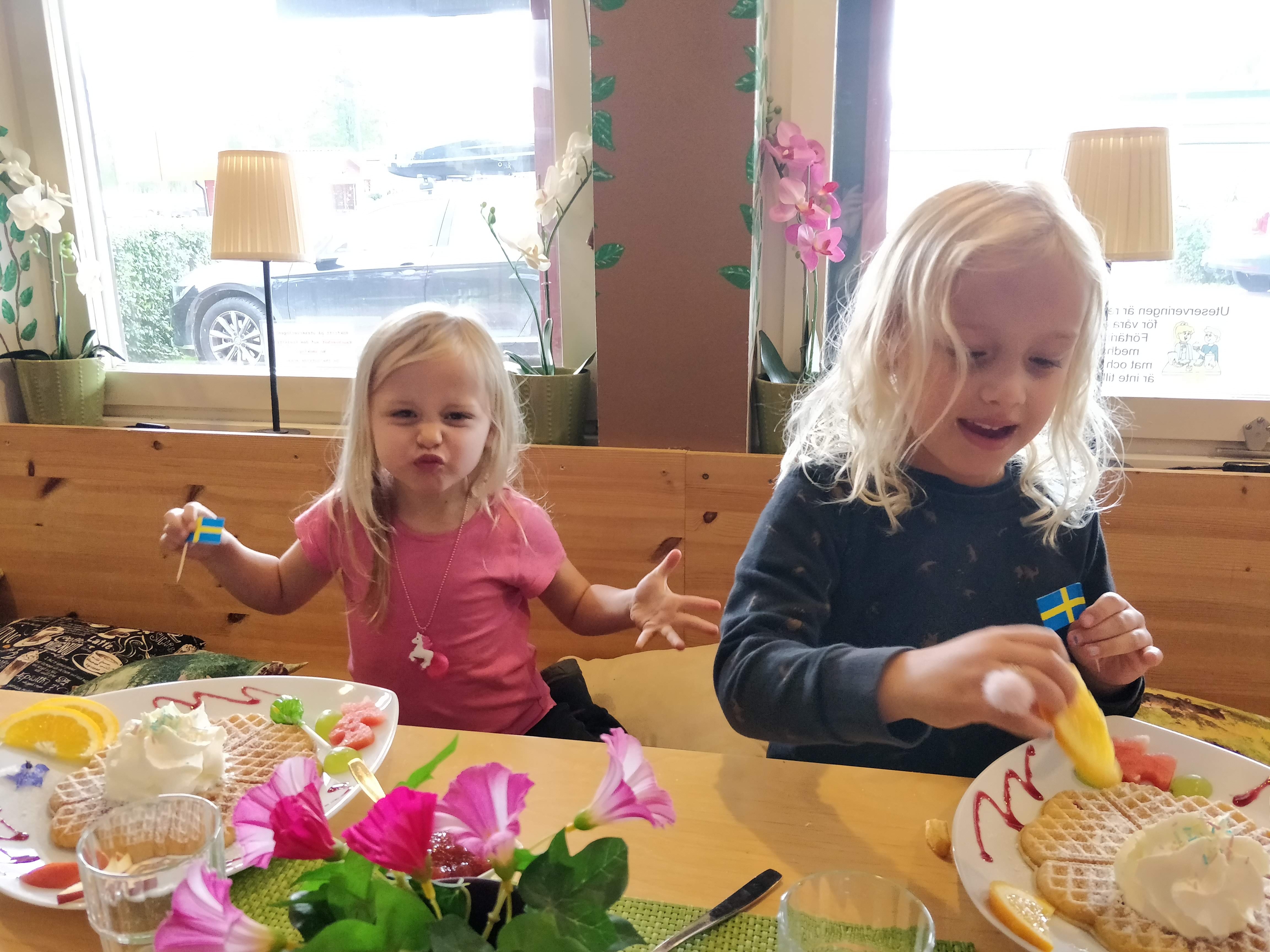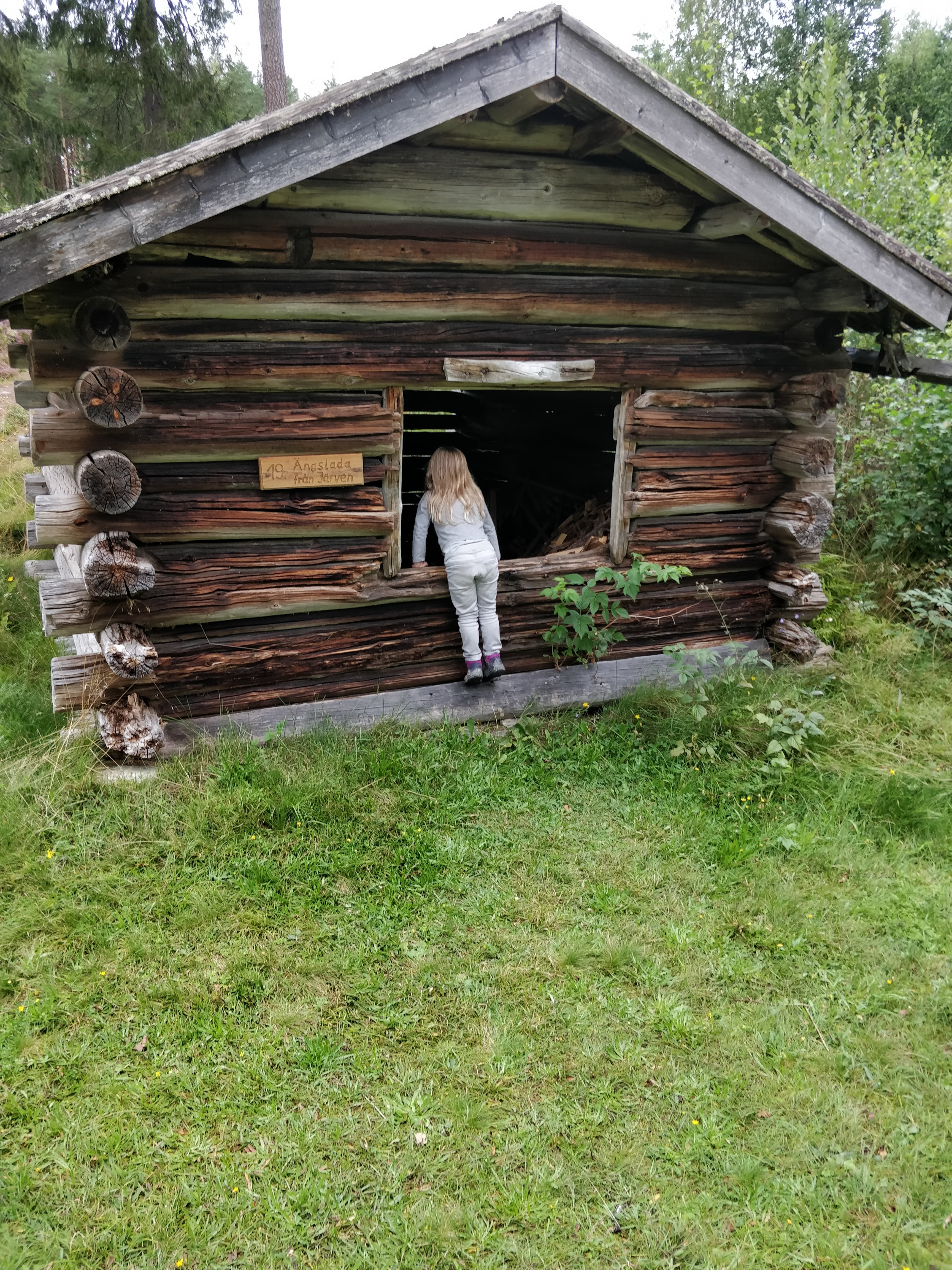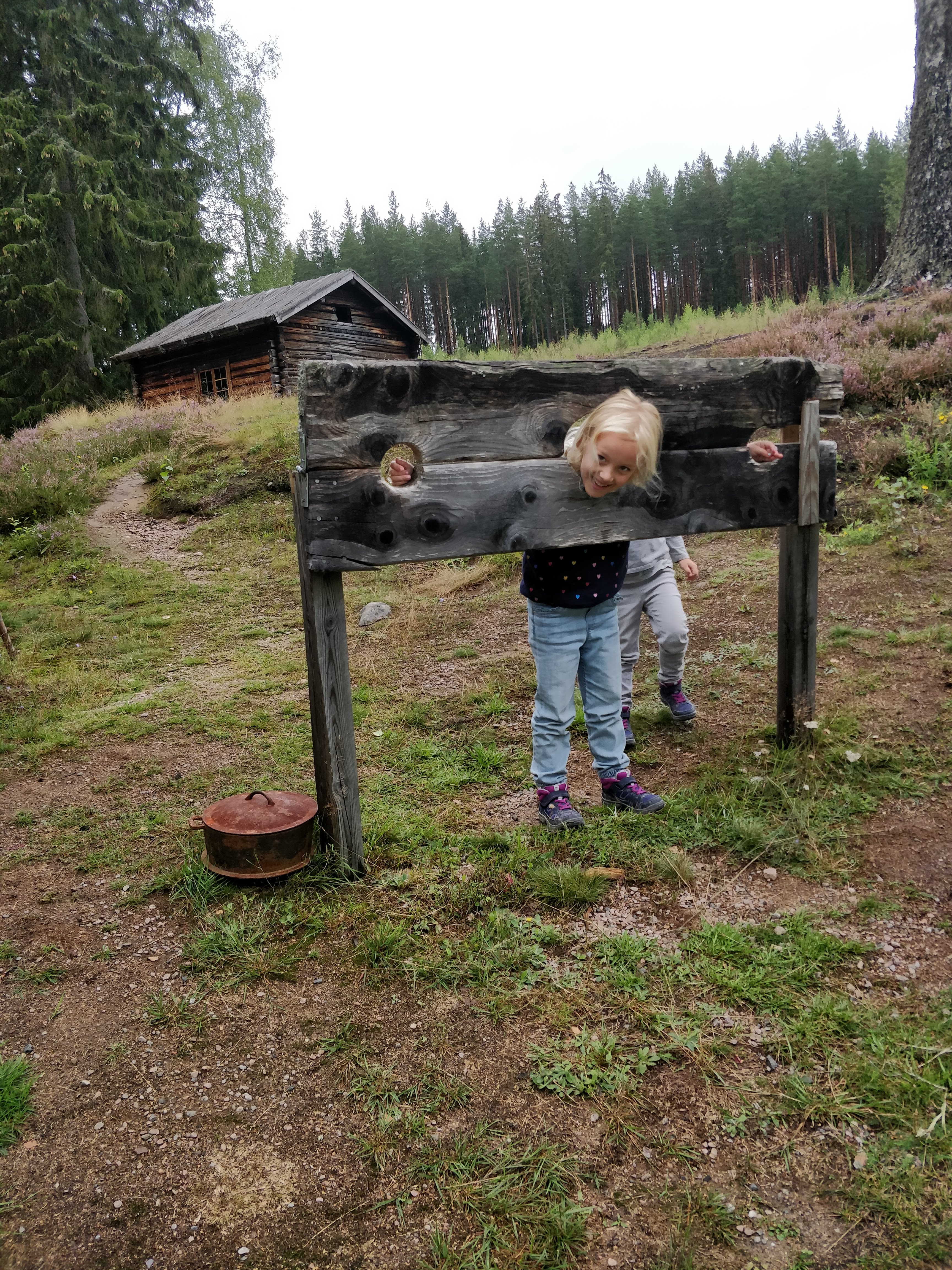 De volgende dag gingen we naar een oud Fins dorp dat nog volledig in tact is gehouden. Hembygdsgarden Karmenkynna lag op zo’n 1,5h rijden van ons verblijf. Toen we hier aankwamen was het zo’n 12° buiten en was alles er heel verlaten. We dachten er iets te vinden om te eten, maar eigenlijk kon je ter plaatse alleen maar traditionele kost eten van havermout en spek (motti och fläsk), wat niet echt een optie was voor de kindjes en eerlijk gezegd voor mij ook niet echt. Rowin vond het allemaal geweldig. Gelukkig konden de kinderen en ik een wafel eten en Rowin kon proeven van de traditionele Finse kost. De herberg zelf was super gezellig. Er was een open haard aan het branden wat onmiddellijk een cozy gevoel gaf (en toch wat raar, zo in de zomer). De gastvrouw was heel lief en vriendelijk. Ze gaf ons wat uitleg over de omgeving en over de tradities van vroeger. Geweldig om al die verhalen te horen. Na het eten gingen we rond op het domein en bezochten we ook nog het aanliggende museum. Het museum was nog niet echt afgestemd op toeristen van het buitenland de uitleg bij de kaartjes was in het Zweeds, je kreeg wel een boek mee met de vertalingen, maar de film die ze er afspeelden was enkel in het Zweeds en dus voor ons onverstaanbaar.