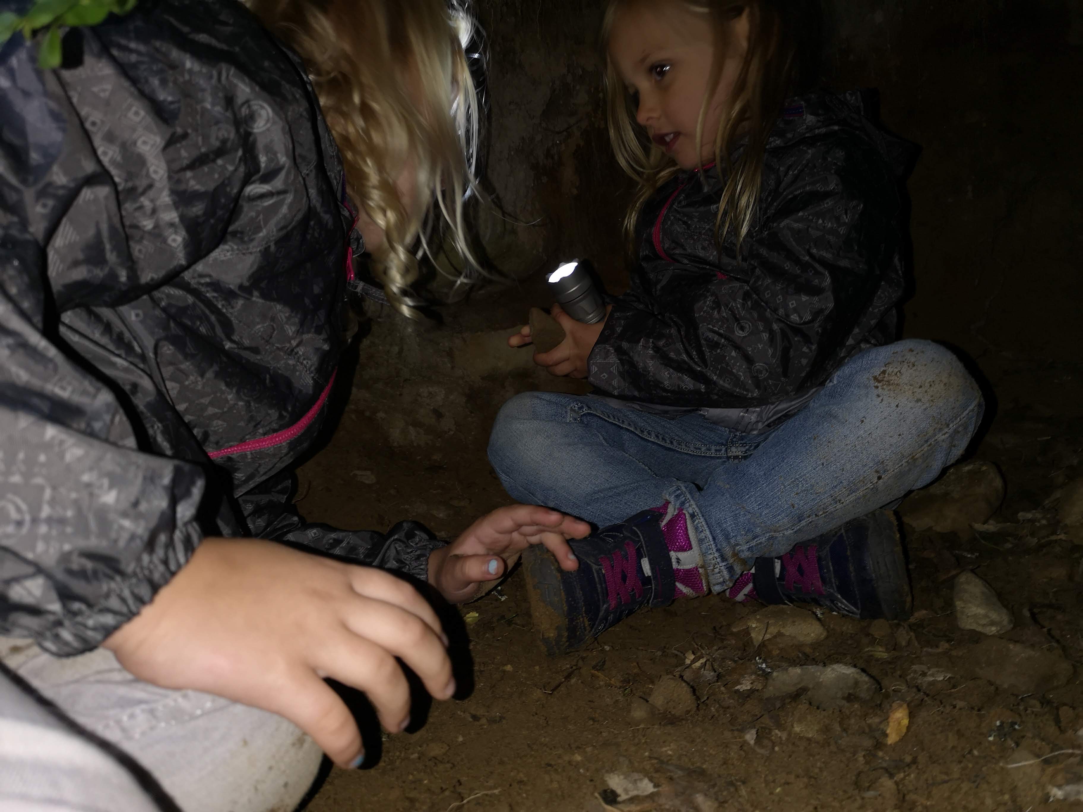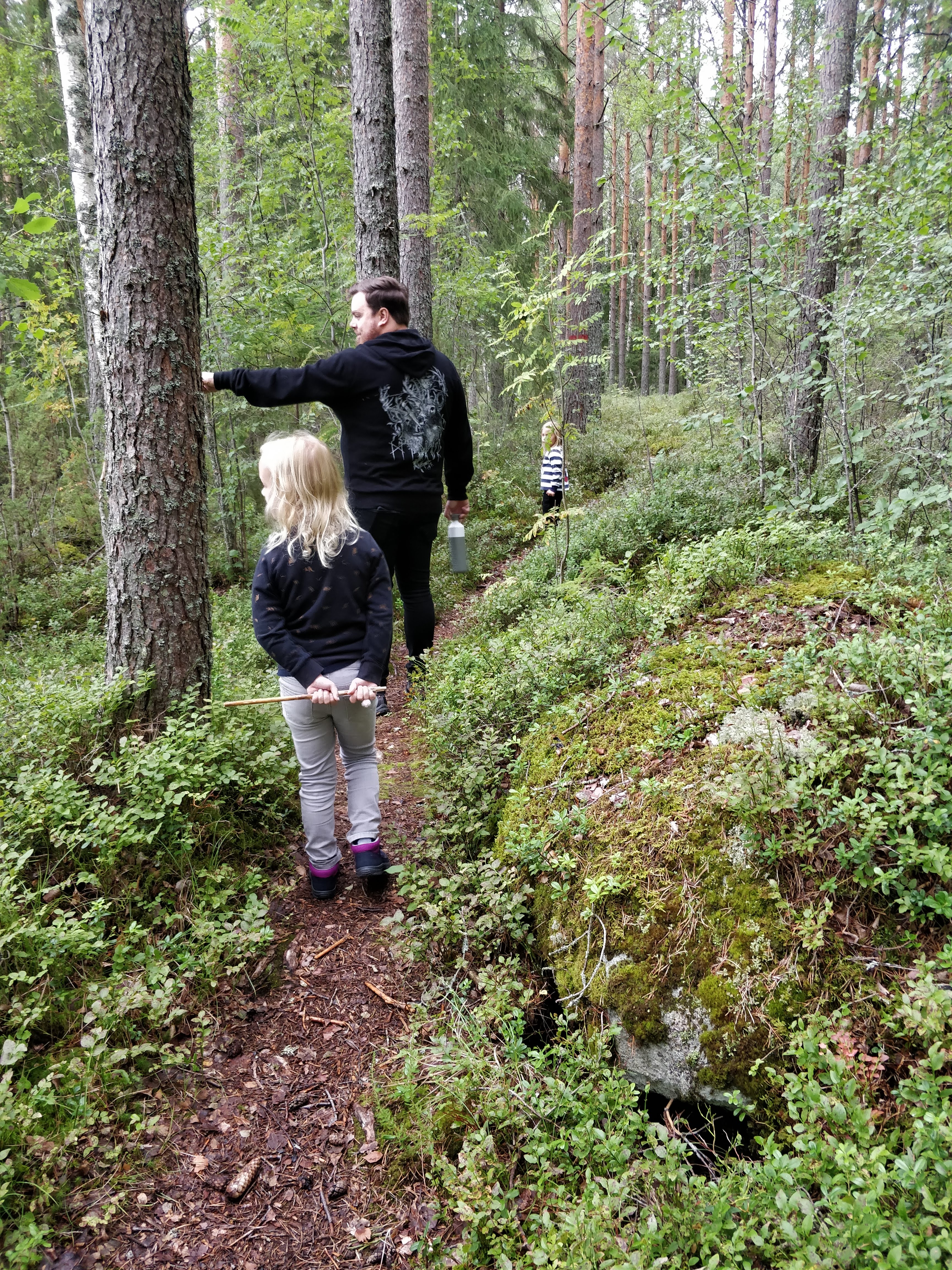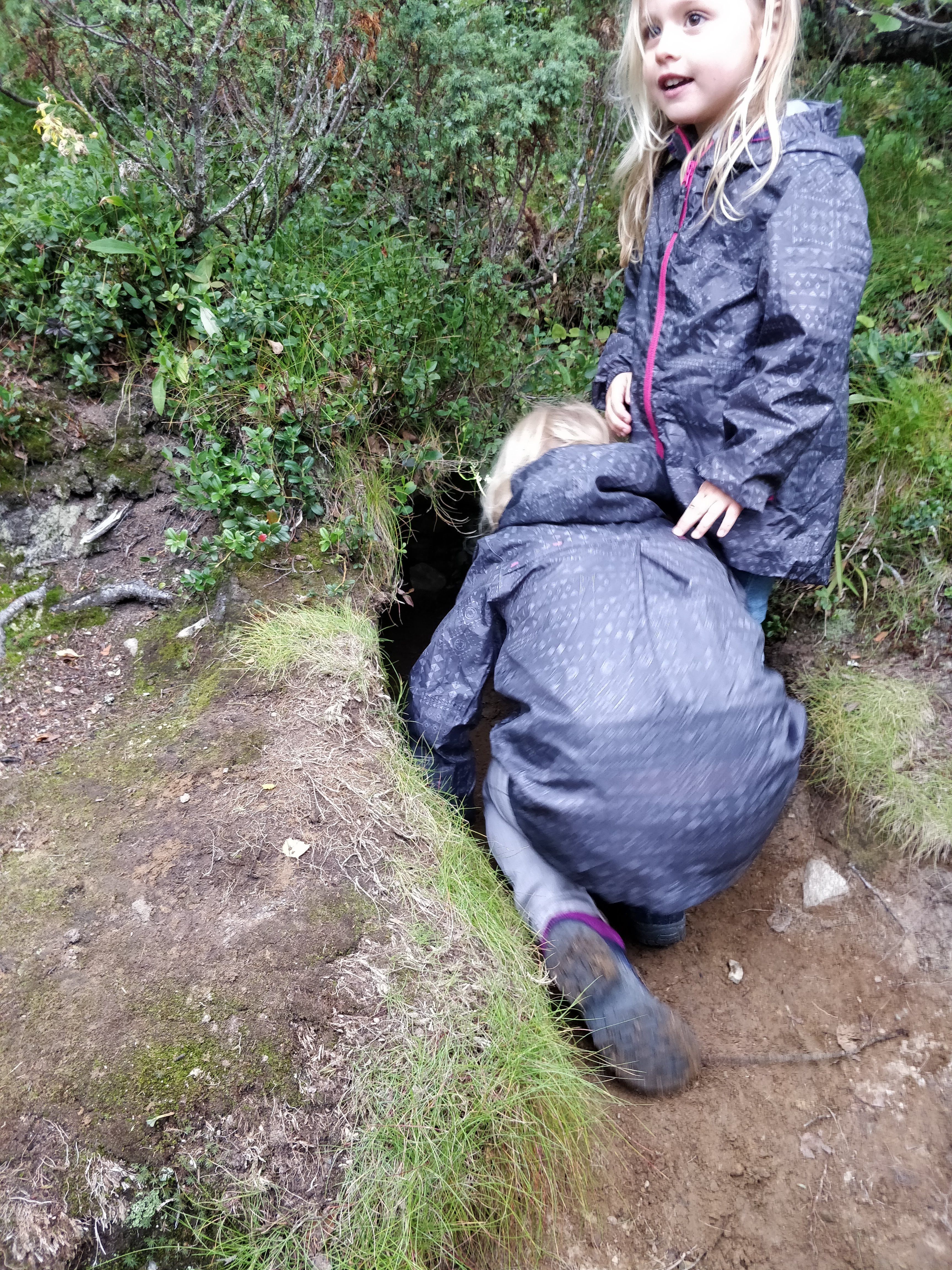 In de namiddag stond er een wandeling van zo’n 3,5 km naar een berenhol op het programma. Samen met een gids en nog andere gezinnen gingen we op wandel. Onze kindjes waren de jongsten van de hoop, maar de wandeling is perfect afgestemd op jonge kinderen. In het begin van de wandeling is het vrij gemakkelijk wandelen, in de 2de helft kwamen er wat rotsen op ons pad, maar al bij al konden onze kindjes het tempo goed aan, al moeten we wel toegeven dat we telkens achteraan bengelden ;-). De gids was een Nederlander die enkele jaren terug verhuisd is naar Zweden. Wel handig, want zo kon hij de uitleg ook in het Nederlands doen, wat leuk was voor de kindjes en voor ons zo moesten we niet altijd alles vertalen :-). Toen we toekwamen aan het hol was het tijd voor Fika! Zo’n geweldige traditie van de Zweden. Na een wandeling is het wel fijn om een kopje koffie of thee te drinken en een koekje te eten. Het berenhol zelf konden we gezin per gezin bezoeken, want het hol lag op een moeilijk bereikbare plaats waardoor niet iedereen tegelijk aan het hol kon staan. Het hol zelf was super klein, nooit verwacht dat er een beer in zo’n hol kan kruipen. Juliette en Oona kropen helemaal in het hol, wij zouden het in principe ook gekund hebben gegeven dat de omvang van een beer in het hol kan, maar dat is toch iets de claustrofobisch voor mij :-). Heel leuke ervaring om te doen. Ook de terugweg verliep vlot, alleen dat Oona even haar schoen verloren was in de modder :-). De wandeling reseveer je best op voorhand. Dit kan via deze link. Deze topdag sloten we af met ons zelf gevangen visje op de barbecue. Heerlijk!