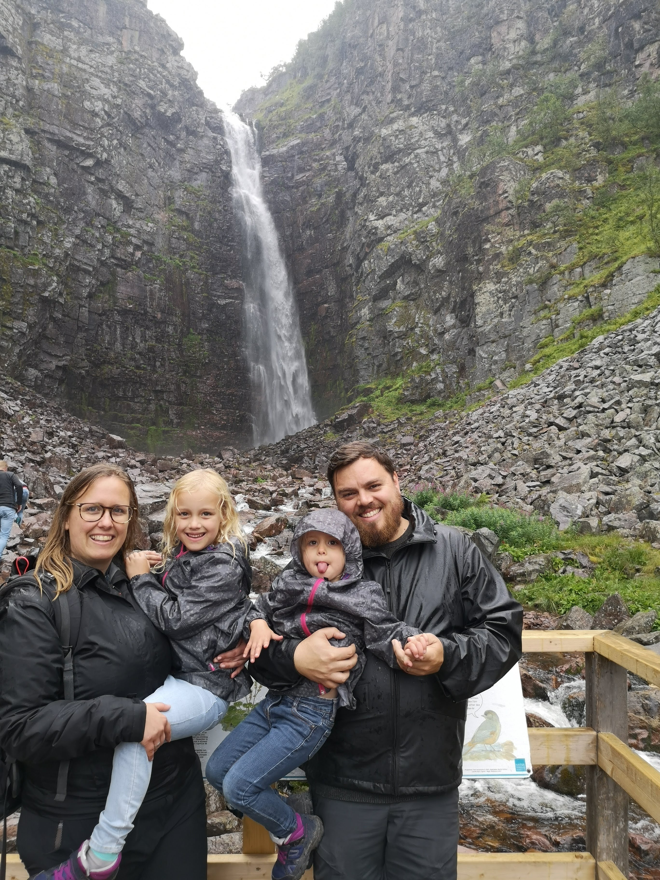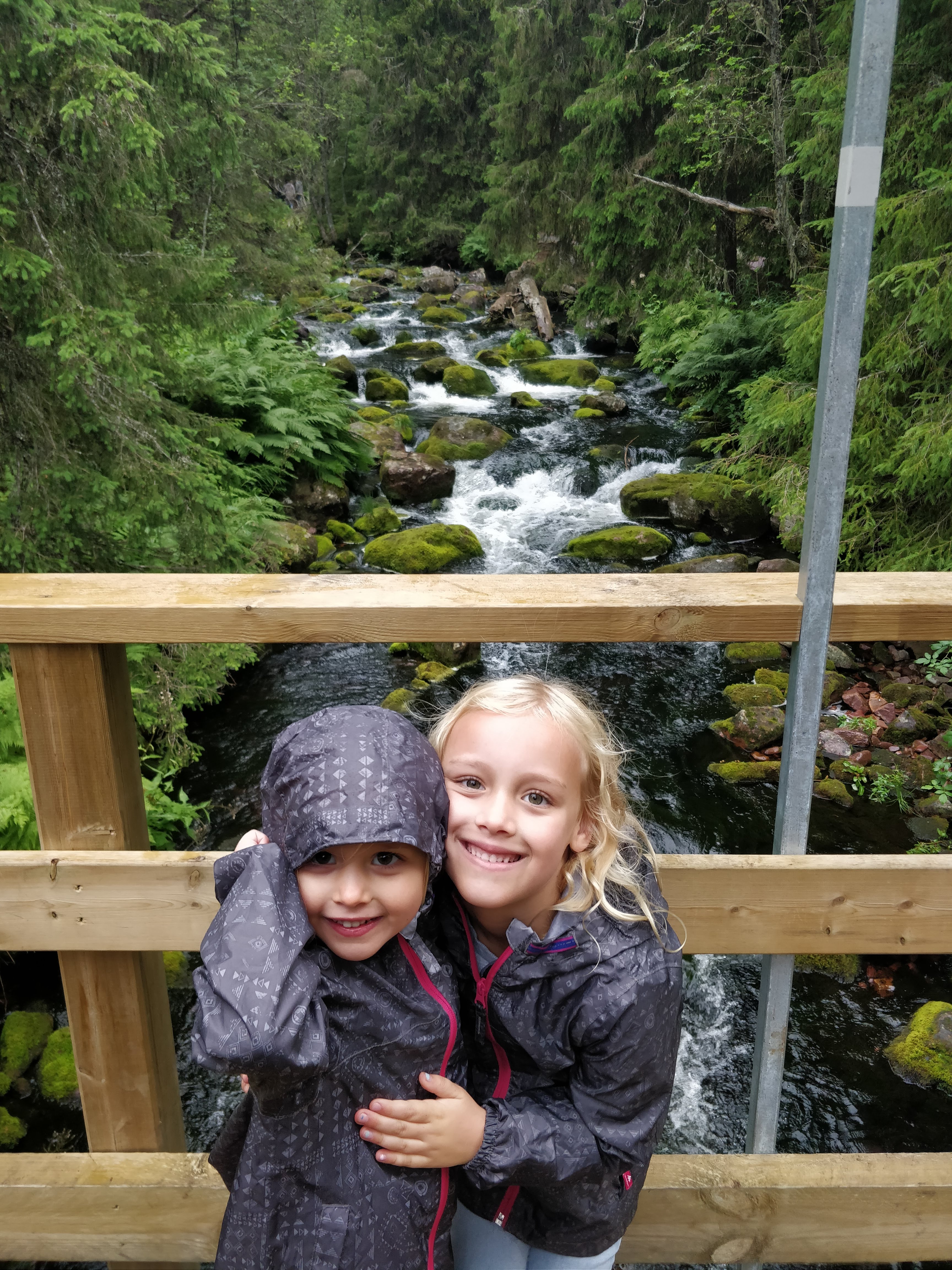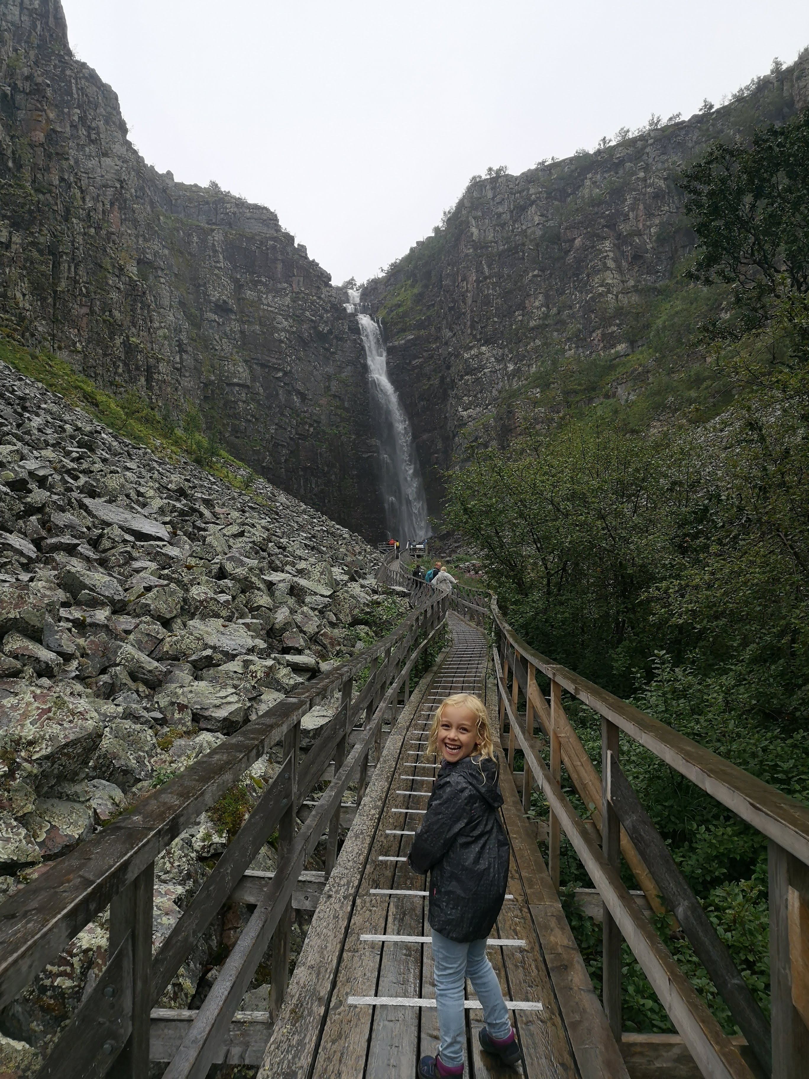Onze laatste volle dag in Zweden was de kers op de taart. We trokken naar Fulufjällets Nationalpark waar we gingen wandelen naar de grootste waterval van Europa. Er zijn verschillende hiking tours, maar wij volgden de kortste van 4 km vooral omdat het de bedoeling was dat de kindjes deze volledig zelf gingen wandelen. We volgden de Njupeskärsslingan hiking tour waarbij op ongeveer halfweg de wandeling de Njupeskär waterval staat wat dus de grootste waterval van Europa is. Ik ben zot van watervallen, dus voor mij was het echt een topmoment. De wandeling zelf was heel goed doenbaar met de kindjes. We moesten een paar keer (stevig) klimmen en op de terugweg wat moeilijkere dalingen (voor de kindjes dan), maar al bij al een gemakkelijke weg. En we zijn heel fier om te zeggen dat ze de 4 km volledig zelf gewandeld hebben. Niet evident met het regenweer en vooral voor onze 4-jarige, een stevige wandeling. De laatste km hebben we wel een ijsje moeten beloven :-). Onze reis in Zweden kon geen beter einde hebben. ’s avonds gingen we nog eten in de brasserie dicht aan ons huisje. Deze keer wel lekker gegeten :-). Na het eten hebben we nog een wanhoopspoging gedaan om een beer te kunnen spotten, onze gids van het berenhol had ons enkele tips gegeven, maar onze poging was helaas niet gelukt :-(. Daarna was het snel tijd om te gaan slapen, want we moesten ’s morgens heel vroeg vertrekken richting Oslo waar we onze boot naar Denemarken gingen nemen.